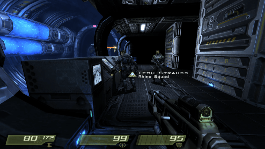 Quake 4 builds on the shooters of the time by actually splitting up the soldiers on the battlefield into various classes. Other shooters, I’ve played rarely differentiated soldiers from another aside from weapons. Quake 4 isn’t your average shooter. As a result, the different soldiers you have assigned to you will open up different strategic options to you. The general uniform is green for just a normal soldier while the medics wear red and white and have the ability to heal you. The soldiers classed as “Techs” have the awesome ability to repair your armor whenever you command them to. Just like you, they will die. There’s no way around it. If you have a Medic or a Tech around you could be more reckless in the way you engage in firefights soaking up as much damage as possible to keep the soldiers behind you alive. Most of the time they stay out of your way and don’t get in front of your shots. You’re not teamed up with them often and most of the combat throughout the campaign is done with you alone but when you are with them it’s a welcome addition to mix up things.