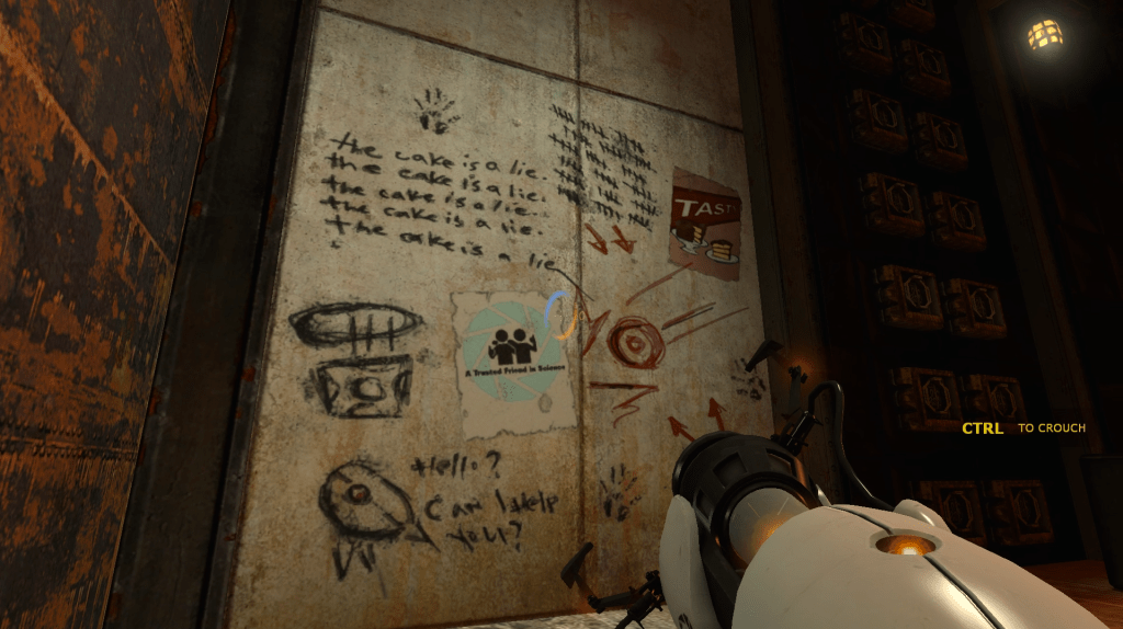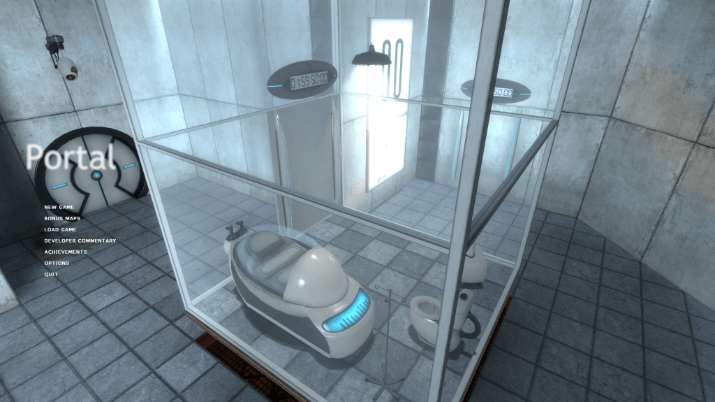 Eventually with test chamber 16 you start to encounter turrets that open fire on you using live ammunition while the Artificial Intelligence G.L.A.D.O.S. acts like nothing is wrong and that this is all the pursuit of science. This is also the first time you start to realize that something has gone horribly wrong with the facility that you’re in. If you’ve been paying attention all along you can notice this from the first room that you wake up in. There is glass that reveals chairs and computers but they’re all empty. Something here has gone horrifically wrong and if you aren’t careful you’ll disappear too.